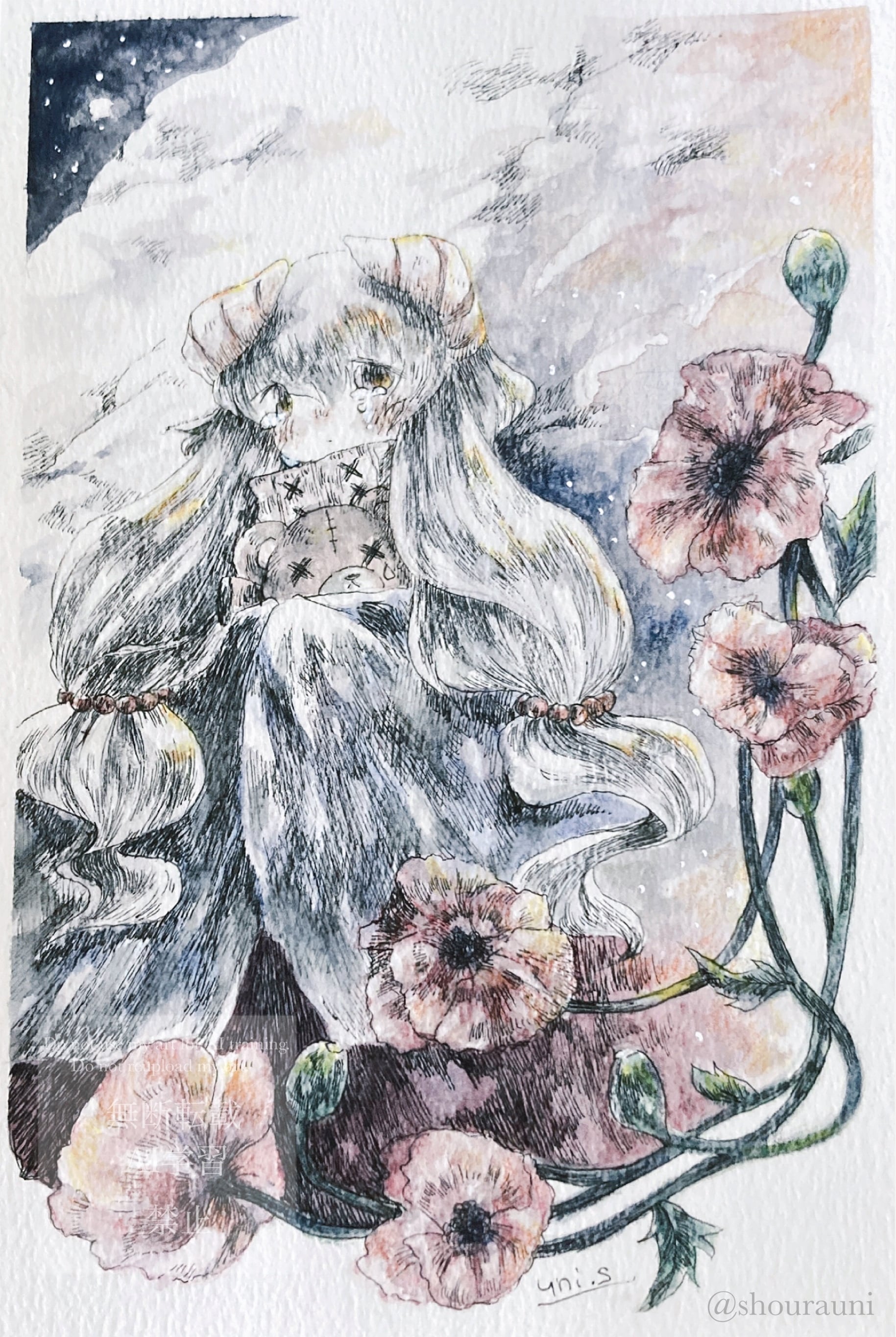 ・使用画材:透明水彩絵の具、顔彩、色鉛筆、ペン